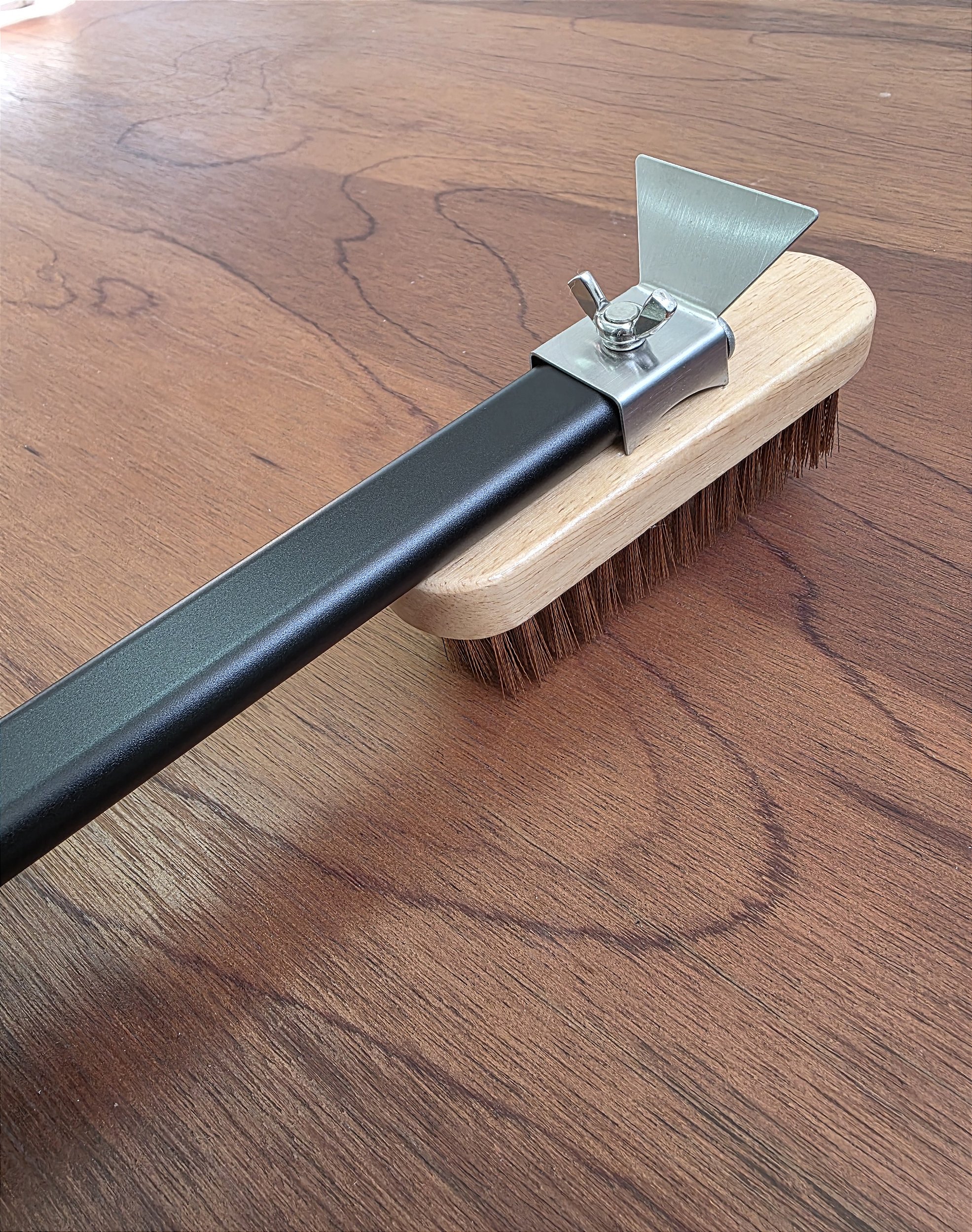 Escova e Raspador de Limpeza para Forno é equipado com cerdas de latão e um raspador traseiro de aço inoxidável, possui um cabo de alumínio anodizado de 75cm. As cerdas de latão proporcionam uma limpeza rápida e eficaz da pedra refratária, removendo restos de comida, farinha e cinzas sem causar danos. O raspador de aço inoxidável na parte traseira é perfeito para eliminar resíduos grudados no fundo do forno.