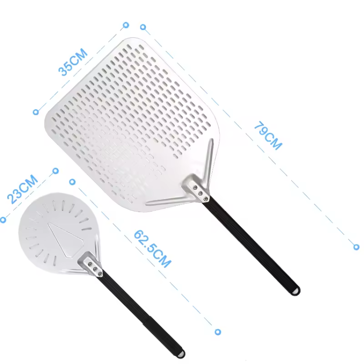 A pá para enfornar, com cabeça de alumínio anodizado, é leve, resistente e fácil de manusear. Sua borda rebaixada facilita o uso, enquanto as perfurações removem o excesso de farinha, garantindo pizzas perfeitas.
